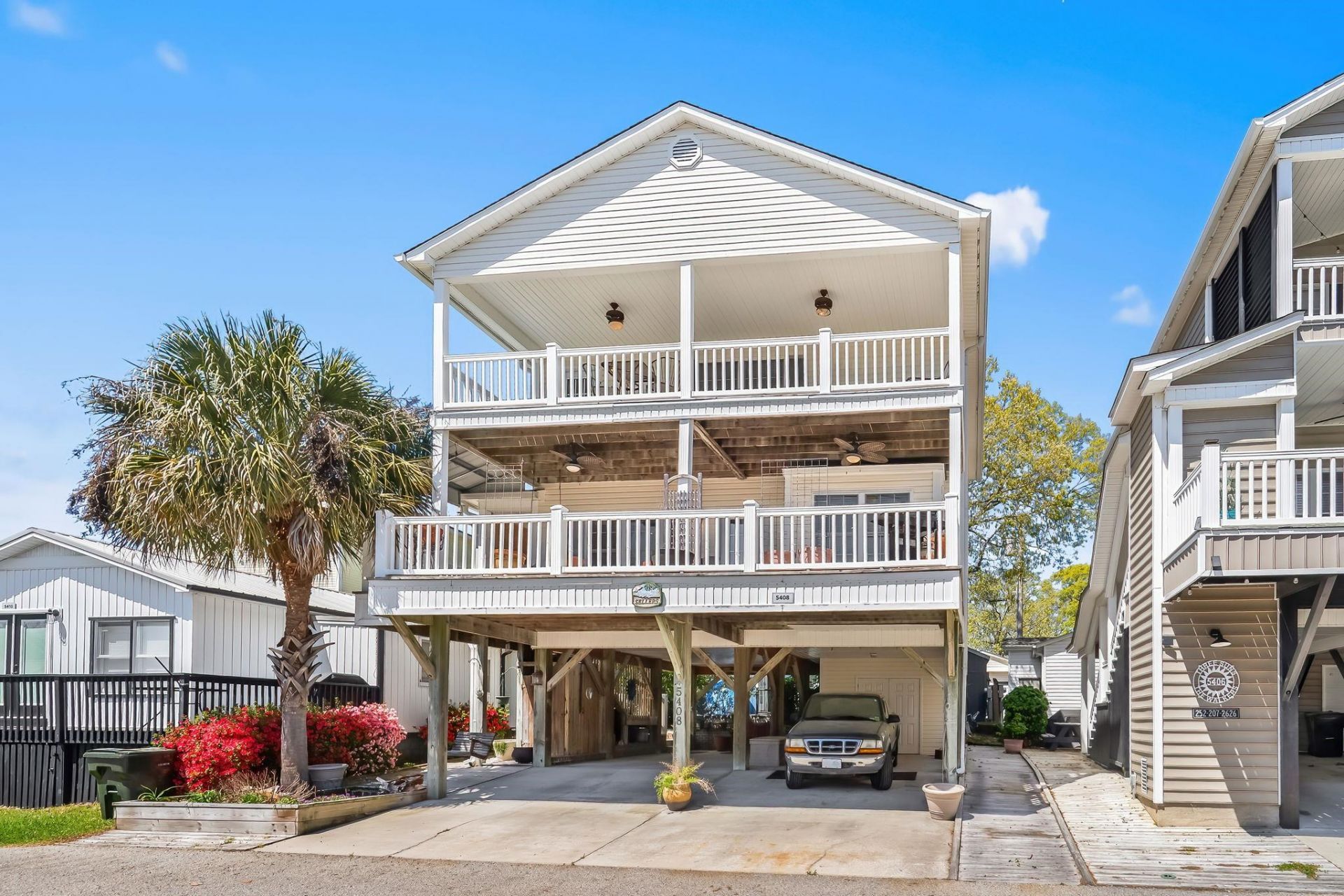 JUST LISTED! WELL BUILT 4 BED/3 BATH RAISED BEACH HOUSE IN THE HIGHLY SOUGHT 5,000 SECTION OF OCEAN LAKES! Never rented, this home has been the primary residence of the owners since it was built in 2004 and they spared no expense in its construction. Upgraded features include an open and spacious layout, hurricane strength windows, two large decks with covered stairs, lots of cabinets and closets for storage, recessed lighting, tall cathedral ceiling in large primary bedroom with a private top deck that has great views and a relaxing ocean breeze. New upgrades include new LVP flooring on main level, new carpet on stairs and top level, new plumbing in bathrooms and kitchen sink, new toilet, and a new HVAC on main level. Home is being sold fully furnished including, a refrigerator and a freezer in the cooled and heated ground level storage building. NO RENTALS TO HONOR! Now Showing! Measurements are not guaranteed and are the responsibility of buyers and/or their agent. There is no HOA in Ocean Lakes, each home is located on leased land with yearly lease, which is payed in two semiannual payments due in January and July. Amenities abound in Ocean Lakes gated community and include almost a mile of white sand beach, 24 hour security, weekly community activities, 7 fishing lakes, free trash pick-up, free cable TV, indoor/outdoor swimming pools, large water park/slides, lazy river, kids splash zone, new dog park, new beachside coffee house and ice cream bar, playgrounds, full size basketball courts, miniature golf, fire pit, corn hole, shuffle board, horseshoes, ping-pong, Sandys Down-under skatepark, recreation building, arcade, general store, golf cart rentals, Sandys Meet & Eat restaurant and more!